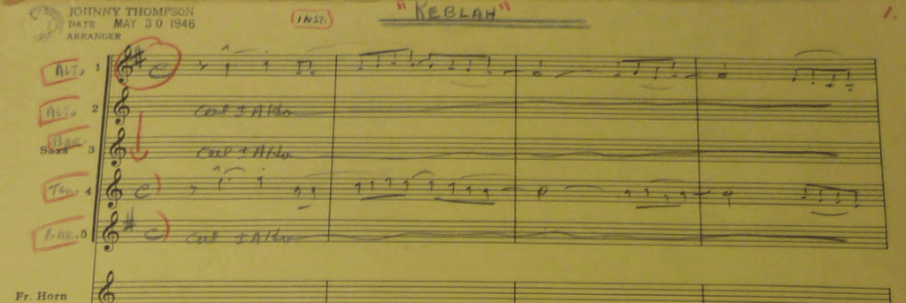 Here is where modern research finally clears up misinformation. Juan Tizol played with the Duke Ellington band, and he later joined the James crew. He was a composer (“Perdido” is his), but too often he was credited with arranging his own music. When Rob DuBoff explored two collections of James music that Harry donated as tax write-offs, he discovered Thompson’s original manuscript of Tizol’s melody “Keb-lah,” so the historic record is now correct. You can look at the first page of Thompson’s score here. Willie Smith and Tizol are the solos.